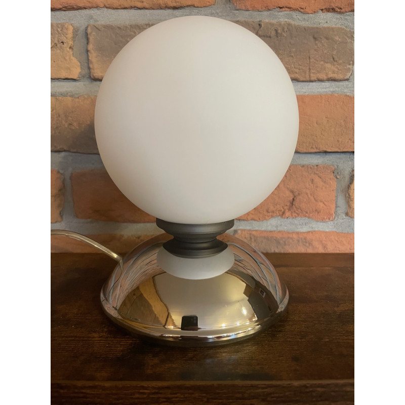 Moderní stolní lampička s chromovým kovovým tělem, na němž je umístěna jednootvorová bílá koule.
